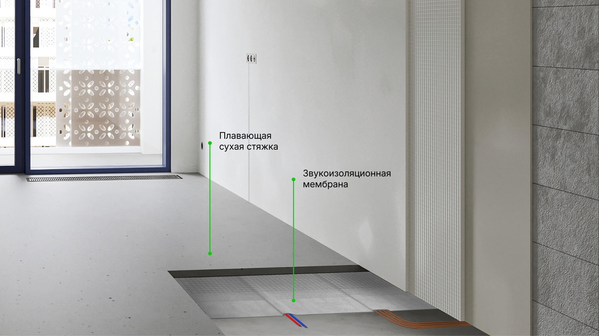 Однако самый сложный тип шума в многоэтажном доме — не голоса, а ударные вибрации: шаги, передвижение мебели или падение предметов. Этот звук распространяется по жесткому каркасу здания, игнорируя стены. Чтобы прервать эту цепочку, мы применили технологию «плавающего пола» с использованием мембраны Звукоизол Флор. Битумно-полимерный материал укладывается на плиту перекрытия с заводом на стены, создавая герметичное «корыто». Цементно-песчаная стяжка заливается внутрь, физически не касаясь ни перекрытия, ни стен. Она буквально плавает на демпферном слое, который гасит любые механические вибрации, не позволяя им уходить к соседям снизу или приходить от соседей сверху.